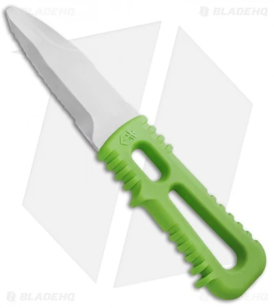 The River Shorty was made to tackle the specific demands of water-related activities like rafting, paddling, and diving. It has a high-carbon stainless steel blade with the serrated sharp side aiming up rather than down and a blunt tip for safety. The handle is green, glass-filled nylon with notched edges for extreme grip. The sheath is constructed of a hard plastic and it can be worn on your belt, boot, or attached to a flotation vest.
